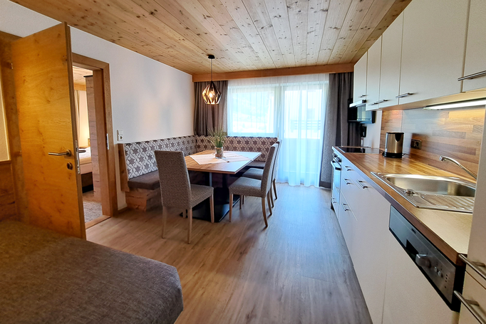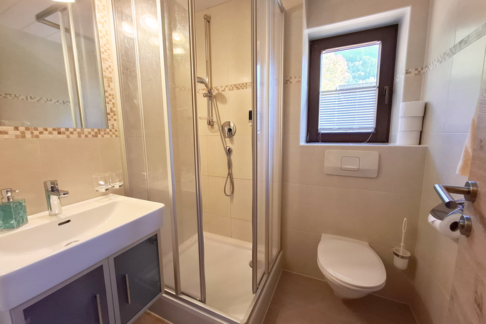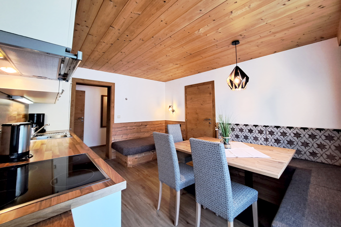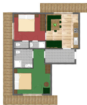 Die Ferienwohnung 2 verfügt über zwei Doppelzimmer für Sie und Ihre Liebsten. Weiters verfügt sie über zwei Duschen und zwei WCs, eine geräumige Wohnküche, einen Vorraum und einen Balkon mit einem herrlichen Panoramablick.
