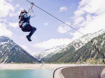 Bei der Flying Fox ZIP-Line an der Schlegeis Staumauer schweben sie in 131 Meter Höhe entlang der Staumauer durch die Lüfte!